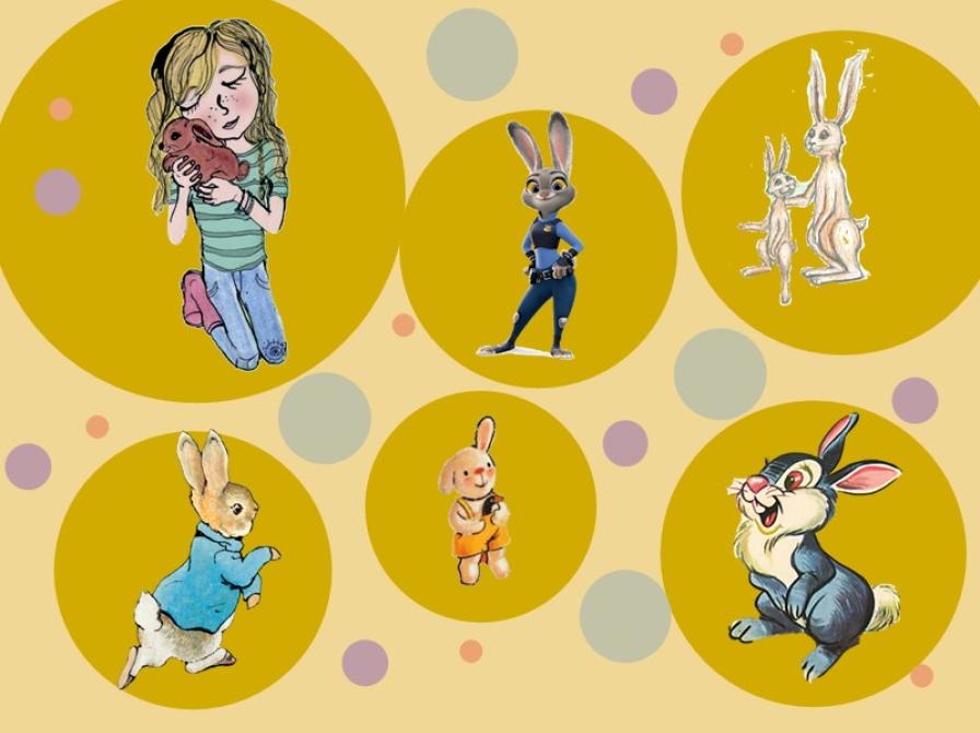 Kaninerne fra litteraturen er hoppet ud af bøgerne og gemmer sig rundt omkring blandt reoler og bogkrybber i børnebiblioteket.